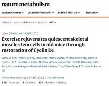 2020年4月刊发在《自然·代谢》杂志一项研究发现,有氧运动可提高老年小鼠的肌肉修复能力,改善老年小鼠的肌肉干细胞功能,使其恢复到年轻状态。老年不运动小鼠的肌肉损伤修复能力明显低于年轻不运动的小鼠;定期锻炼的年老小鼠的肌肉损伤修复能力比不锻炼的对照组好很多。⑥