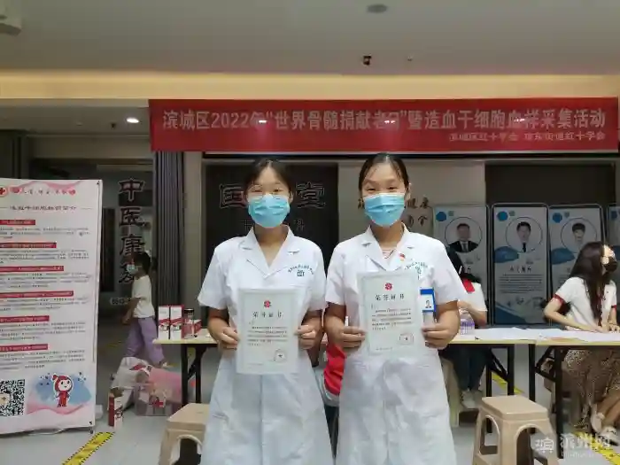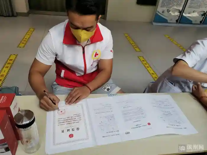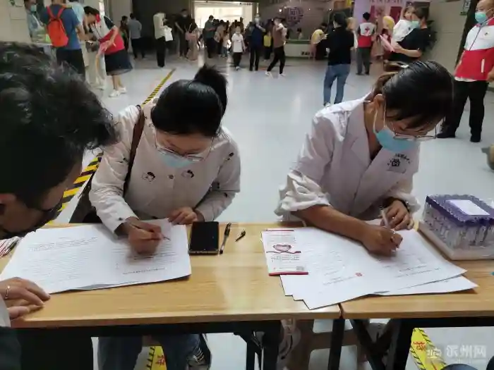 在现场,造血干细胞志愿捐献者们造血干细胞志愿捐献者在滨城区红十字会工作人员的指导下填写《中华骨髓库入库志愿者登记表》《入库志愿者同意书》。中心医务人员对捐献者采集了血样,区红十字会工作人员还为捐献者发放造血干细胞捐献者荣誉证书和纪念品。