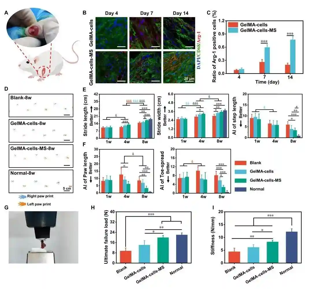 图3.基于MS纳米颗粒的免疫多细胞支架实现了对大鼠RCT的免疫调节和功能恢复。(A)大鼠RCT示意图。(B)植入支架周围巨噬细胞中M2极化相关标记物(Arg-1/CD68)的免疫荧光染色图像。(C)Arg-1阳性巨噬细胞与巨噬细胞总数的数量比。(D)不同组术后8周的爪印。不同组支架治疗的大鼠量化的(E)空间步态参数和(F)爪参数。(G)治疗后的大鼠的肩袖生物力学测试图像。不同支架治疗后肩袖的(H)最大破坏载荷和(I)韧性。