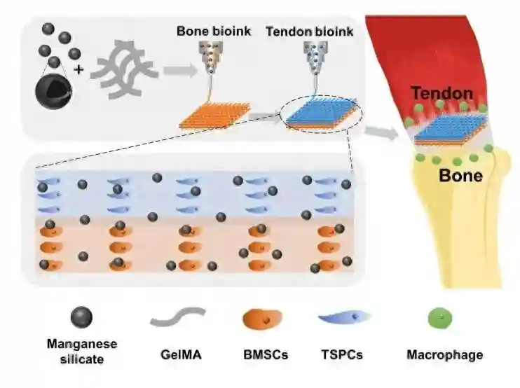 图1.基于硅酸锰(MS)纳米颗粒的免疫多细胞支架用于肌腱-骨一体化再生的示意图。