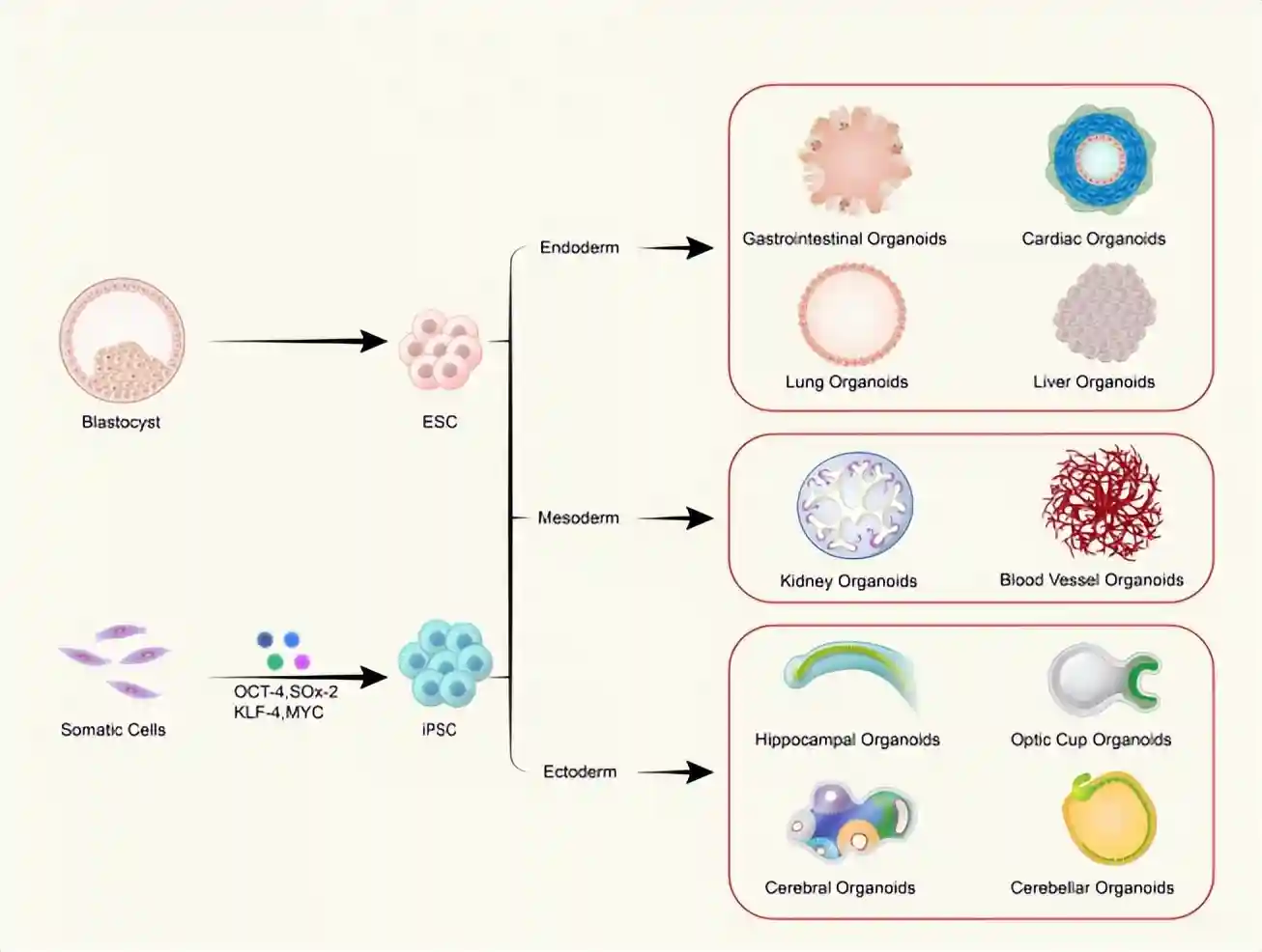 胚胎干细胞(ESC)和诱导多能干细胞(iPSC)被探索用于研究用途。通过引入四种转录因子,体细胞(Somaticcells)可以被重新编程为iPSC。随着发育的进行,囊胚分化为胚胎干细胞,并进一步形成所有三个胚层:内胚层、中胚层和外胚层。胚胎内胚层(oderm)随后产生胃肠系统、心脏、肺和肝脏。中胚层(mesoderm)发育成肾脏和血管系统,而外胚层(ectoderm)形成神经外胚层,最终形成具有不同区域的大脑,包括海马(hippocampus)、视杯(opticcup)、小脑(cerebellum)等。